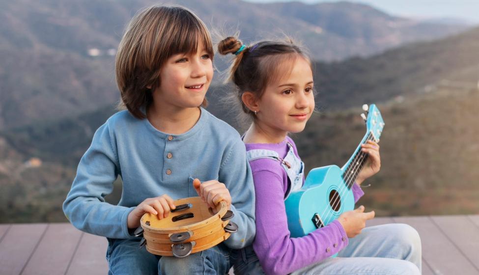 To barn som spiller gitar og perkusjon